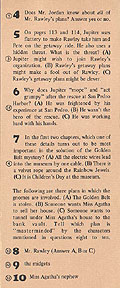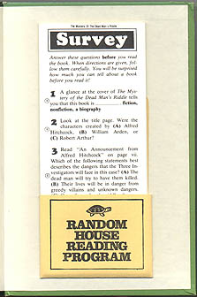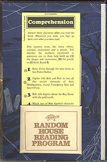 In the 1970s and '80s, several Three Investigators books, in the GLB Edition, were part of the Random House Reading Program (RHRP). The RHRP had been in existence since at least the 1950s; I do not believe it is still around today. The program consisted of teacher's kits and published books that contained instructional material and questions to improve reading skills, in areas such as comprehension and vocabulary. The books chosen to be part of the program spanned all genres, but were prevalent in the non-fiction Landmark Books division of Random House. RHRP books can be found with such diverse titles as Satellites in Outer Space and Smoke Patrol.