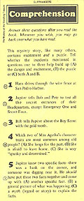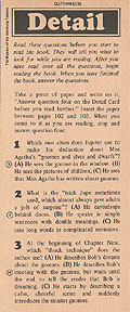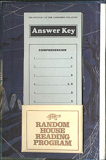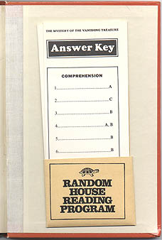 The text of books that were part of the Random House Reading Program was not changed. Instead, there was a cardpocket glued to a front or rear endpaper of the books that contained five cards with questions and/or activities about the story. The card topics were Comprehension, Detail, Vocabulary, Survey and Activity. Teacher copies of the books also contained two Answer Key cards which had the answers for Comprehension, Detail, Vocabulary and Survey. In school, each child would receive a copy of the book to read and then would have to complete the cards as an individual and/or group assignment.