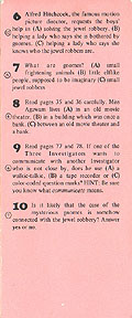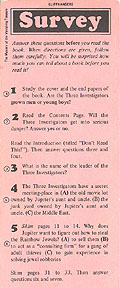I am very fortunate to own several Three Investigators RHRP books, including three different printings of Vanishing Treasure. It is interesting to see how the cards changed over the years. From 1970 thorough 1975/1976, the cards were multi-colored, with one color for each topic. By 1977, the cards were all white. In addition, the early 1970s copies of Vanishing Treasure's cards had a Group Activity section on the Activity Card; this is not present on any Activity cards from about 1975 on. Also, the early cards contained no copyright dates; again, these were present from 1975 on. The multi-color cards also contain a heading at the top, such as "High Action" or "Cliffhangers", with the book's title along the left edge. The white cards do not have the heading, but have the book's title there instead.