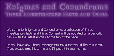 -- The Weekly Reader edition (based on Random House's Revised edition) of #3 The Mystery of the Whispering Mummy did not contain Hector Sebastian's introduction, but did contain his meeting with the boys at the end of the book. Why the introduction was eliminated is anyone's guess... -- Scholastic never referenced each book's number in any location (spine, covers, inner list, etc.). -- The first documented mystery solved by Jupiter Jones occurred before The Three Investigators were officially formed. The mystery involved Mrs. Andrews' missing engagement ring and is described in the first few pages of #1 The Secret of Terror Castle. -- Because of the GLB Edition's stronger binding, their endpapers were attached in a different manner than the Trade Edition, and are nearly always found with the left and right sides of the graveyard/spiderweb illustration reversed. -- All Random House paperback titles printed in 1978 and 1979 did not have the book's number on the spine. For example, a First Printing of the First Paperback Edition of #11 The Mystery of the Talking Skull (printed in 1978) does not have a number on the spine, but the Eighth Printing (most likely printed in late 1980) does. -- At the end #2 The Mystery of the Stuttering Parrot, Alfred Hitchcock states that Carlos, the Mexican boy The Three Investigators helped in the story, works at the Rent-'n-Ride Auto Rental Agency and lives with the Joneses. He works in the Salvage Yard one day per week to pay for his room and meals. There is one small problem in that Carlos is never mentioned again in any of the books. [Source: The Three Investigators Readers' Web Site] -- M.V. Carey was working on the 44th book, entitled The Mystery of the Ghost Train, when the series was cancelled. [Source: The Three Investigators U.S. Editions Collector's Site] -- The series' North American editions have had numerous cover artists, with Bill Dodge the most recent. He was responsible for the Current 1998 - 2000 Random House Issues of numbers 1 - 11 and tended to draw the boys as very young, much younger than the text would indicate. -- Surprisingly, many of the nineteen Scholastic "small-size" Three Investigators books were still being printed in 1988, one year past Random House's end of the original series! -- In #9 The Mystery of the Screaming Clock, Harry and his mother live at 309 Franklin Street. This was Robert Arthur's actual street address when he lived in Cape May, New Jersey! [Source: The Official Three Investigators website] -- For the first three books in the series, Alfred Hitchcock's face/head appears in the cover art of the Trade Hardcover and GLB editions. In the #1 The Secret of Terror Castle, his face is part of the bricks of the dungeon wall; in #2 The Mystery of the Stuttering Parrot, his head is a bust on the file cabinet in Headquarters; and in #3 The Mystery of the Whispering Mummy, his face is on the wall wearing the headgear of an Egyptian pharaoh. -- The cover art for the Scholastic paperback edition of #10 The Mystery of the Moaning Cave was by the original artist, Harry Kane, but it was not quite the original art. For this edition, the original work was updated with subtle style differences more appropriate for the 1970's. -- Random House's Find Your Fate series was not exclusive to The Three Investigators, featuring other genres and characters, such as fantasy stories with The Thundercats. Because of this, The Three Investigators' Find Your Fate titles are numbers 1, 2, 7 and 8. Numbers 3 - 6 exist, but do not revolve around The Three Investigators. -- As it was not nearly as popular as the original books, the Crimebusters series abruptly ended before the "forthcoming" twelfth title could even be published. This title is listed in later books as #12 Brain Wash. An additional thirteenth title written by G.H. Stone exists in manuscript form and would have been published as #13 High Strung. -- Although Random House's Revised Paperback Edition is not very popular with fans, its existence provides the only opportunity for collectors to have a complete, uniform, set of paperback Three Investigators books: Robert Adragna cover art, no internal illustrations and the keyhole design on the cover and spine. -- Depending on the author, Chief Reynolds is either a well-meaning mentor to The Three Investigators or a grumpy adult who views the boys' investigations as meddlesome. For example, Robert Arthur and William Arden portray the Chief with the former disposition, while M.V. Carey typically uses the latter. [Source: The Three Investigators Readers' Web Site] -- In #5 The Mystery of the Vanishing Treasure, admission for the boys' visit to the Peterson Museum to view the Golden Belt and Rainbow Jewels costs only $0.25 admission each! Ah, to return to 1966 prices... -- Both hardcover and paperback Three Investigators books can often be found with a remainder mark. This mark designates that the book did not sell at the published price; extra or defective stock of the book was remaindered to a wholesale dealer for discount sales. The mark is usually on the bottom edge of the textblock and is red or black stamp in the form of the publisher's symbol (in this case, the Random House "house") or simply a red marker line. -- Intended to be used and then discarded, The Three Investigators' Book of Mystery Puzzles is one of the most difficult titles to find, particularily without any writing inside. Available in paperback only and originally priced at $1.50, pristine examples can now cost more than $100.00. -- In 1983, a Random House promotional Three Investigators bookmark was available for free in libraries that carried the series. The bookmark featured Stephen Marchesi's cover art from #10 The Mystery of the Moaning Cave and had the phrase "I Love Mysteries!" on the front. The back listed all 36 paperback titles available at the time, with a noted price of $1.95. -- Of the first 28 hardcover titles, only five of the covers are artist signed. These